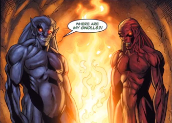 Gnolls are conscidered to be half humanoid half hyena but but first introduced in 1974 told to be a cross between a gnomes and trolls but evolved into the humanoid hyena they are today. They are known to be worshippers of the demon lord Yeenoghu, who also holds domain over ghouls.Some gnolls stand as tall as eight feet and weigh up to 320 lbs. Gnolls are generally depicted in the game world as feral nomads who kill and pillage without warning