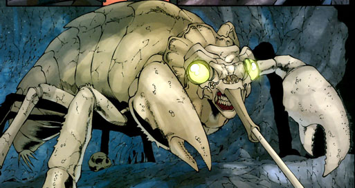 The hook horror is an aberration that stands about nine feet (274 cm) tall and weighs almost 350 pounds (160 kg). It has a mottled grey exoskeleton, which is extremely thick and dense, and as difficult to breach as metal armor. Instead of hands/paws/claws, its front limbs end in 12-inch-long (30 cm) razor-sharp, blade-like hooks. These hooks are, of course, the hook horror's primary method of combat. Its legs are similar to those of a bird, and its head is shaped like that of a vulture, including the hooked beak. Its eyes, however, are multifaceted like that of an insect. It is thought that the hook horror is distantly related to the cockroach, despite its bird-like qualities[citation needed]. Hook horrors have their own language, communicating in a series of clicks and clacks. In a cave, this eerie sound can echo a long way and can be used to estimate cavern sizes and distances, much like the sonar of a bat.