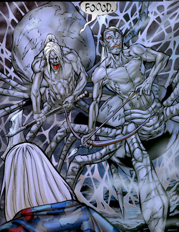 Only high-level priestesses in good standing with Lolth are able to initiate the transformation of a dark elf into a drider. This transformation is very painful, and lasts at least 12 hours. Driders develop a poisonous bite. Their digestion changes and they must drink blood of living creatures for sustenance. Driders still maintain the spells and special abilities they had developed as a drow. There can exist any character class of drider. They retain intelligence and memories. This usually makes them bitter, spiteful creatures. Some hunt for magic powerful enough to undo the transformation. Driders appear sexless due to bloating, but able to magically reproduce. Driders seem to retain their gender and characteristics after the transformation, but fertility is debatable..